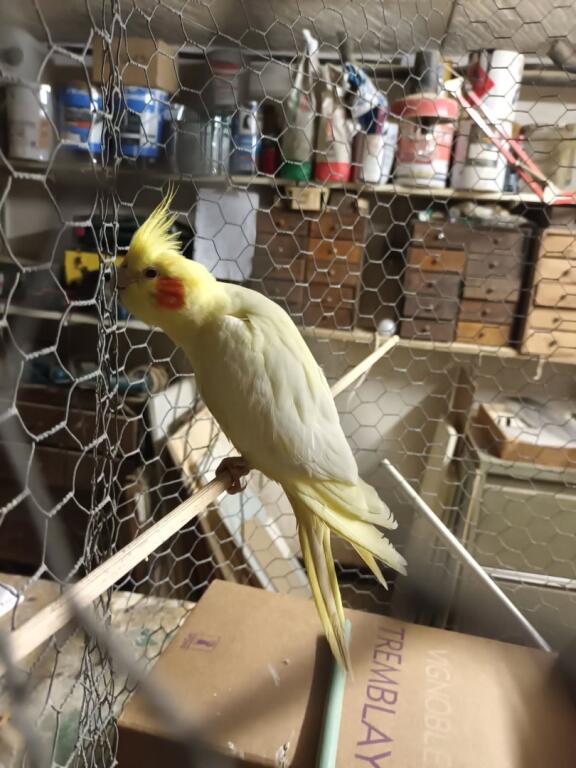 Une jolie perruche jaune clair et blanche a été récupérée par un habitant.